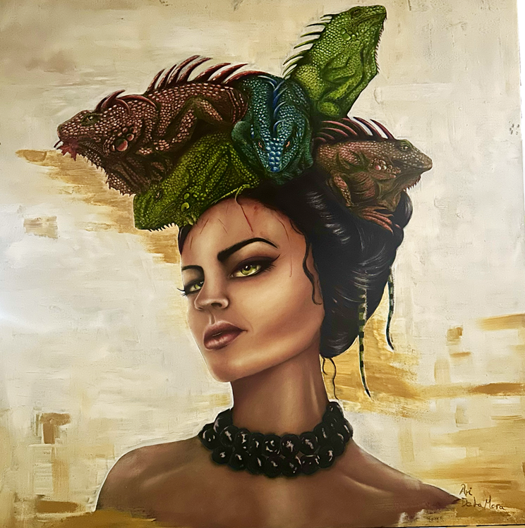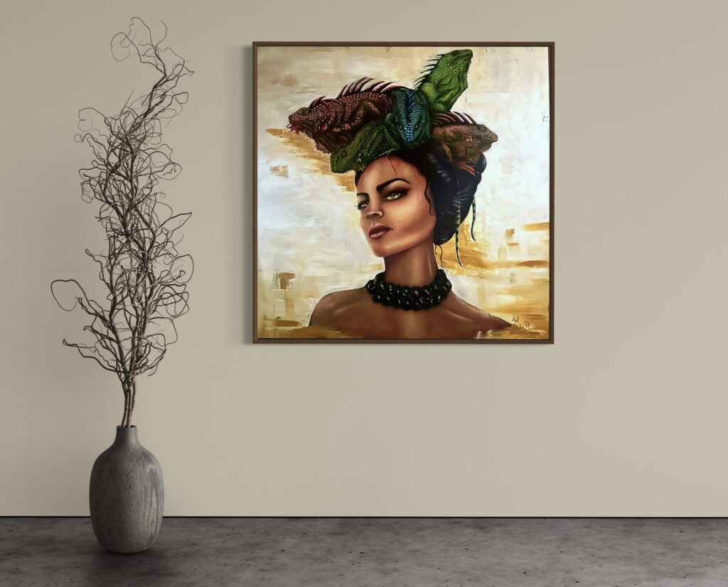 A bold and captivating portrait, Queen of Reptiles invites the viewer into a dreamlike world where symbolism, femininity, and nature intertwine. Painted with rich oils and intricate detail, this piece embodies both mystery and strength.