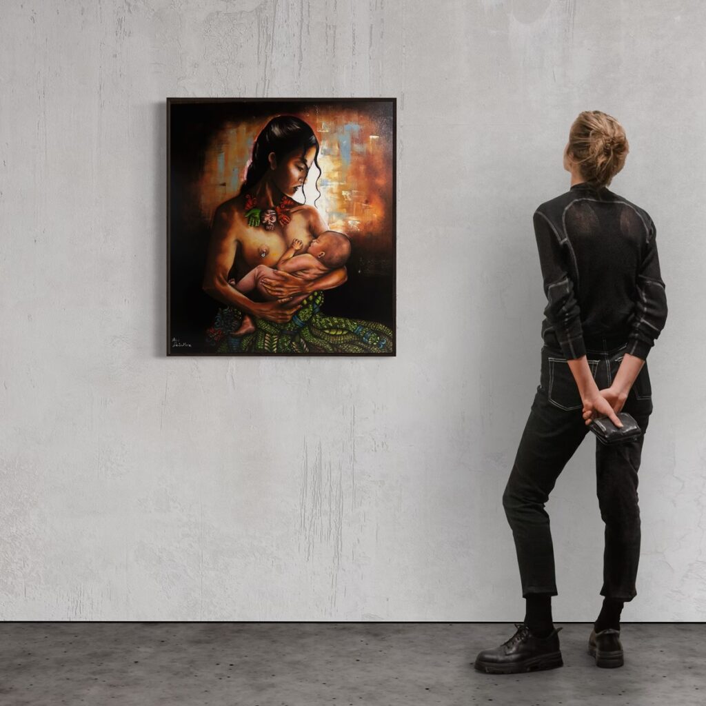 Aztec Mother is a powerful tribute to ancestral roots and maternal strength. Inspired by pre-Hispanic iconography and mythology, this piece blends cultural reverence with contemporary expression. Bold brushwork and earthy tones evoke both grounding energy and timeless resilience.